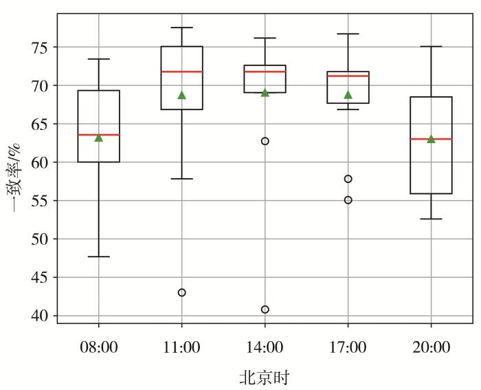 由2019年12个气象站5个时次总云量及FY-4A云覆盖率一致率箱线图(图5)来看,11:00、14:00、17:00两者一致率较高,平均一致率分别为68.72%,69.06%和68.79%,中位数分别为72.60%、72.33%和71.23%;08:00和20:00的一致率较低,平均一致率分别为63.20%和63.01%,中位数分别为63.56%和63.01%。这可能与太阳高度角和卫星成像条件密切相关,11:00—17:00太阳高度角较高,可见光通道对云的识别精度提升,且地表反射率与云的差异更显著,减少了薄云与高反射地表(如荒漠)的误判;而08:00和20:00太阳高度角低或无日照,卫星主要依赖红外通道反演,受地表温度与云顶温度差异减小等因素影响,云边界识别精度下降,导致与地面观测的一致性降低。