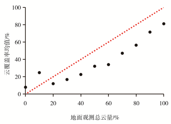 (The red dotted line represents the ideal trend line, where the satellite cloud cover product is equal to the mean of the total cloud cover observed on the ground)