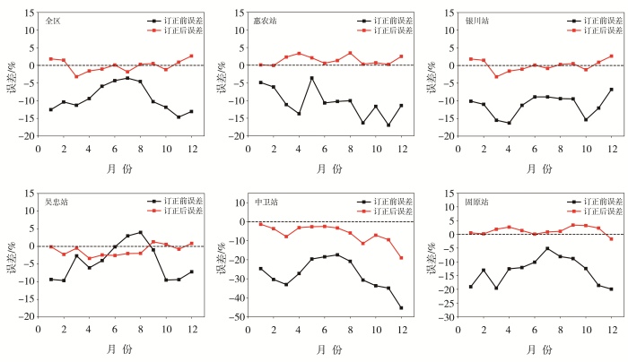 利用归一化混合订正法对FY-4A云覆盖率产品进行订正,全区及代表站订正效果如图7所示。订正前FY-4A云覆盖率与气象站总云量差异较大,经过归一化混合订正法订正后,偏差大幅降低,各月的平均值与气象站云量基本吻合,全区平均、惠农站、银川站、吴忠站、固原站误差在5%以内,接近于气象站观测值;中卫站订正效果相对较差,但各月均在20%以内。
