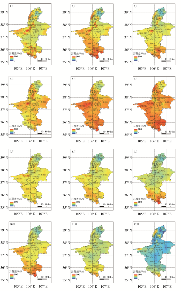 由经过订正后的逐月FY-4A云覆盖率遥感影像(图9)可知,宁夏日间云覆盖率呈现上半年(1—6月)高于下半年(7—12月)的分布特点,尤其是5—6月全区云覆盖率普遍较高,银川市及以北大部地区为60%~80%,12月云覆盖率最低,全区大部云覆盖率为10%~40%。