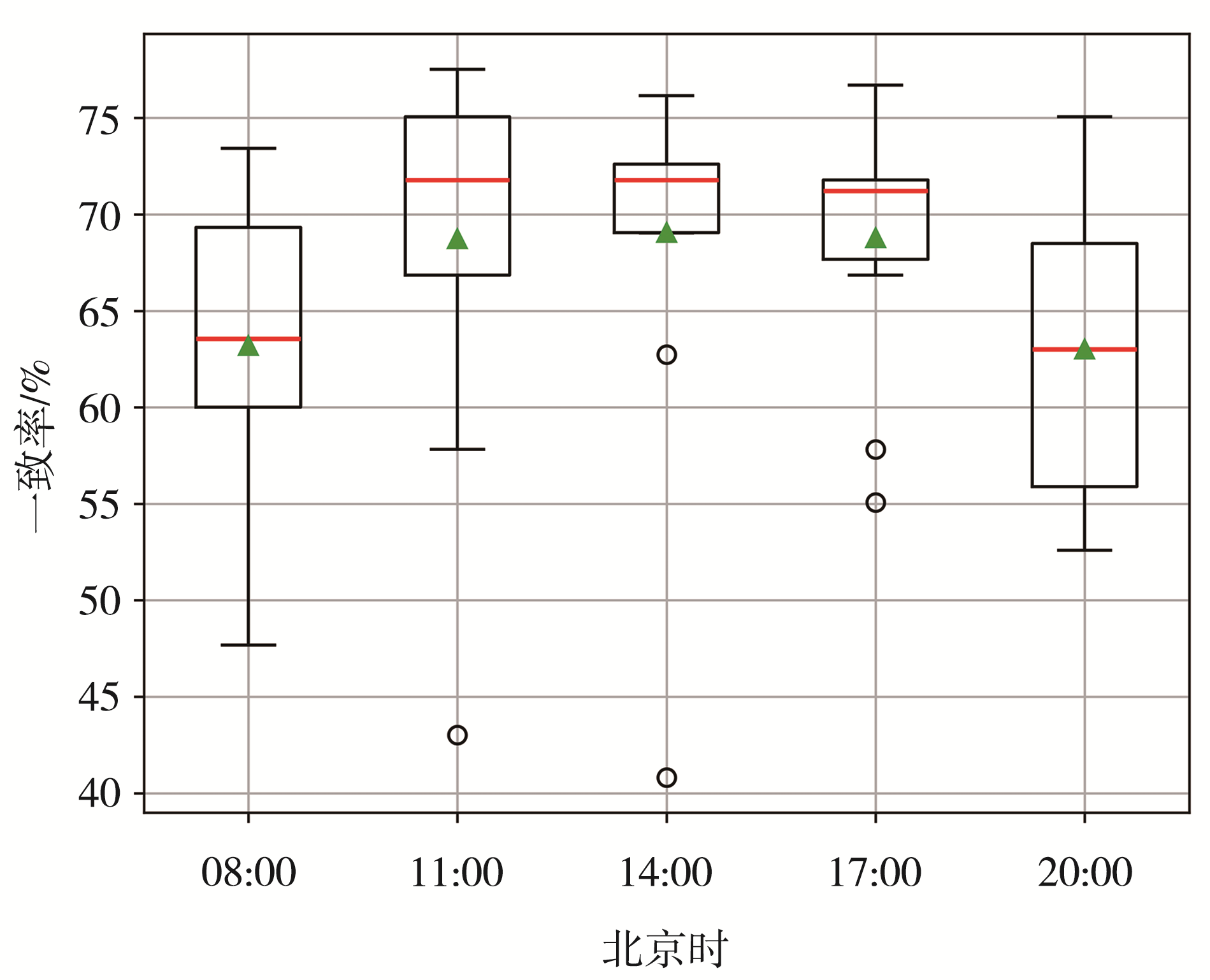 | 图5 2019年宁夏12个气象站不同时次总云量及FY-4A云覆盖率一致率箱线图 (红色实线代表中位数,绿色三角代表平均值,黑色空心圆圈代表异常值) |