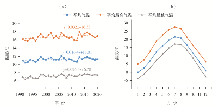 Inter-annual variation (a) and monthly variation (b) of average temperature, average maximum temperature and average minimum temperature in Kangxian County from 1991 to 2020
