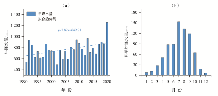 Inter-annual variation (a) and monthly variation (b) of precipitation in Kangxian County from 1991 to 2020