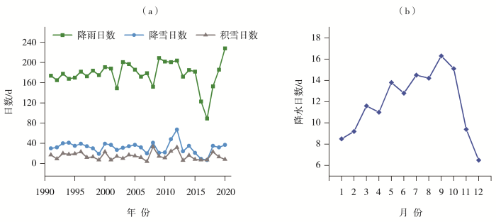 Inter-annual changes of rainfall, snowfall and snow cover days (a) and monthly average precipitation days (b) in Kangxian County from 1991 to 2020