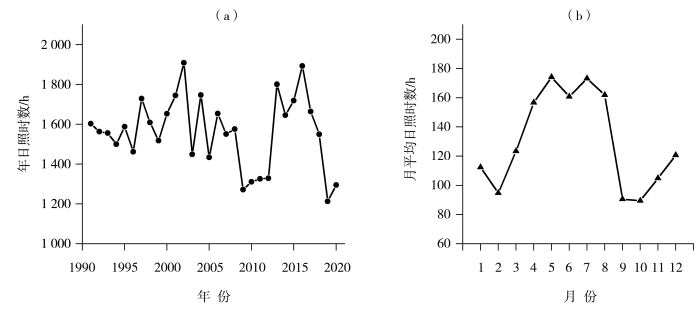Inter-annual (a) and monthly (b) variation of sunshine duration in Kangxian County from 1991 to 2020