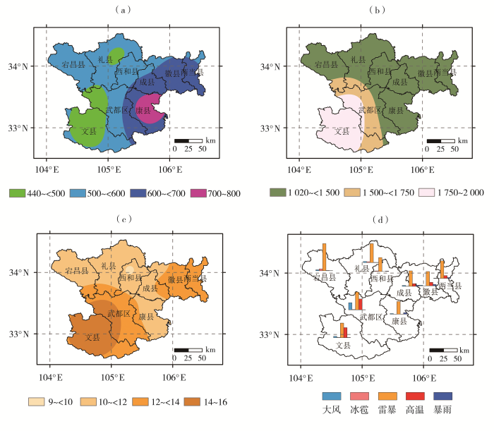 1991—2020年陇南市年平均降水量(a,单位:mm)、年平均潜在蒸发量(b,单位:mm)、年平均气温(c,单位:℃)、年平均灾害性天气日数(d,单位:d)空间分布