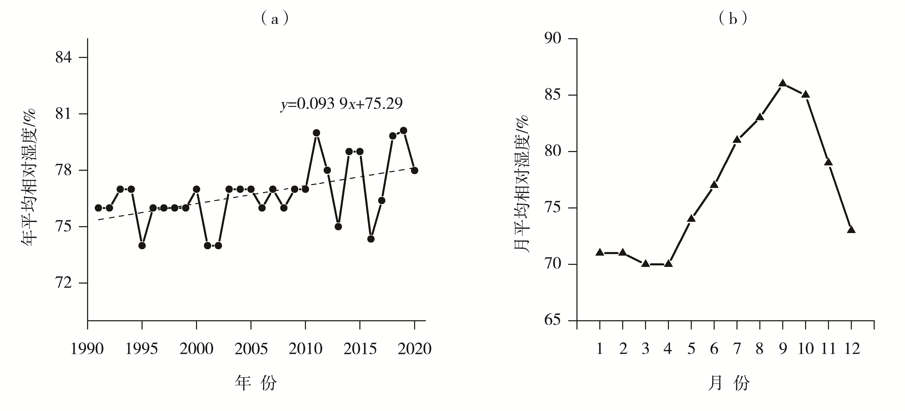 | Fig.8 Inter-annual (a) and monthly (b) variation of average relative humidity in Kangxian County from 1991 to 2020 |