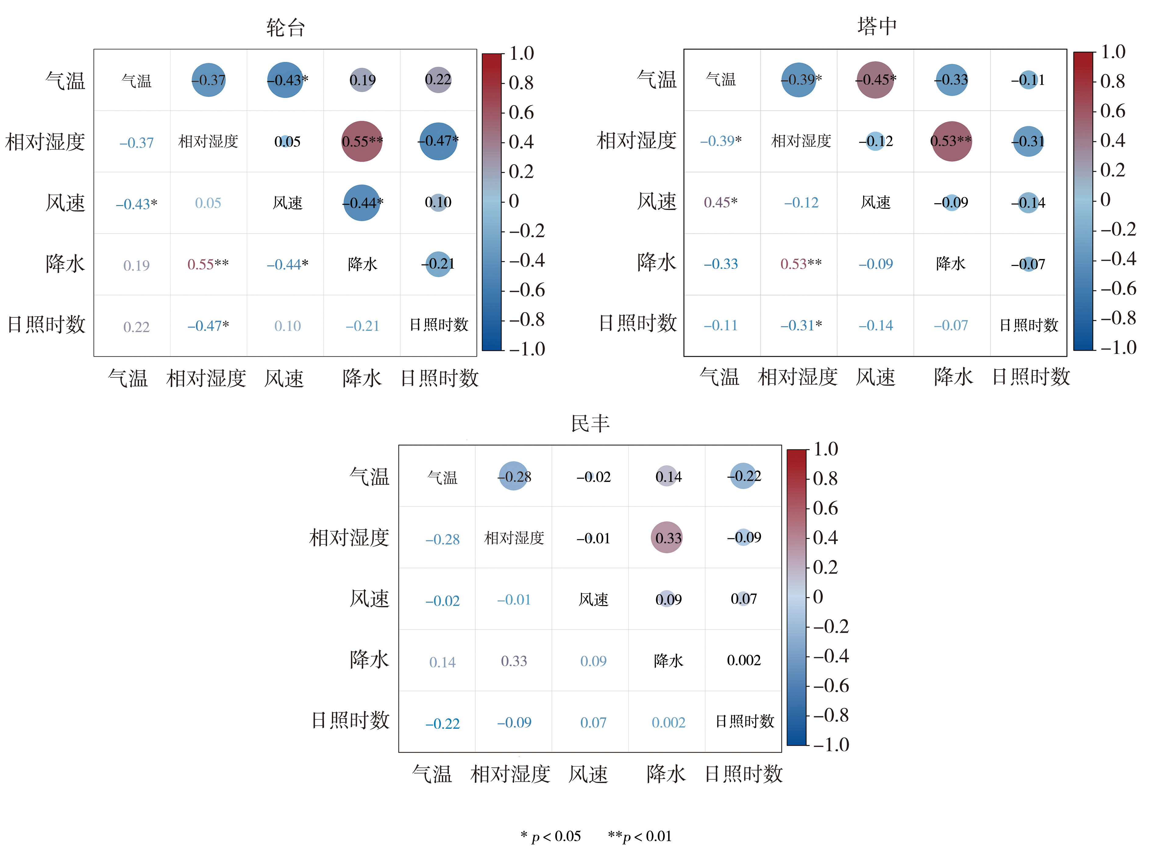 | 图2 1997—2024年塔克拉玛干沙漠轮台、塔中和民丰站不同气象要素的相关性 |