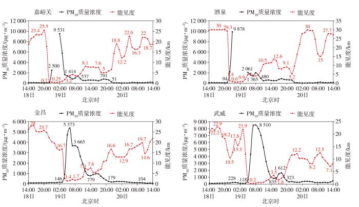 2023年3月20日沙尘过程河西走廊不同地区PM10质量浓度与能见度逐时变化