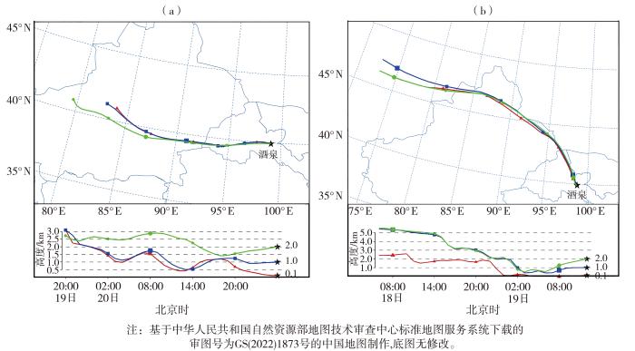 2023年3月21日02:00(a)、4月19日12:00(b)酒泉站HYSPLIT模型分析