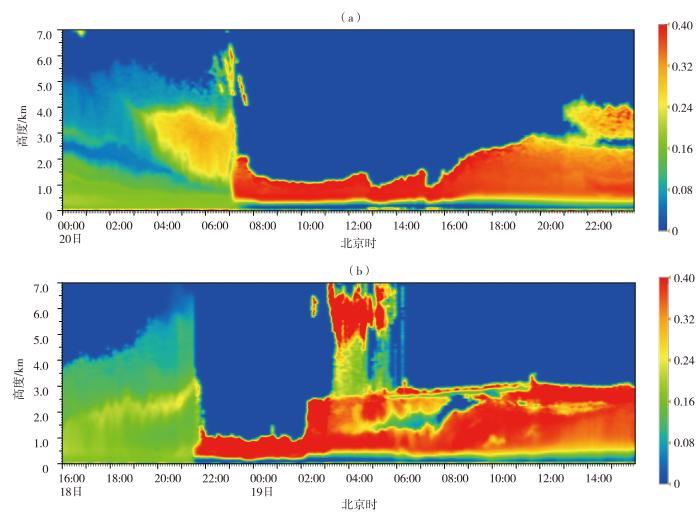 2023年3月20日(a)和4月18日(b)沙尘过程中酒泉站退偏振比时间-高度剖面