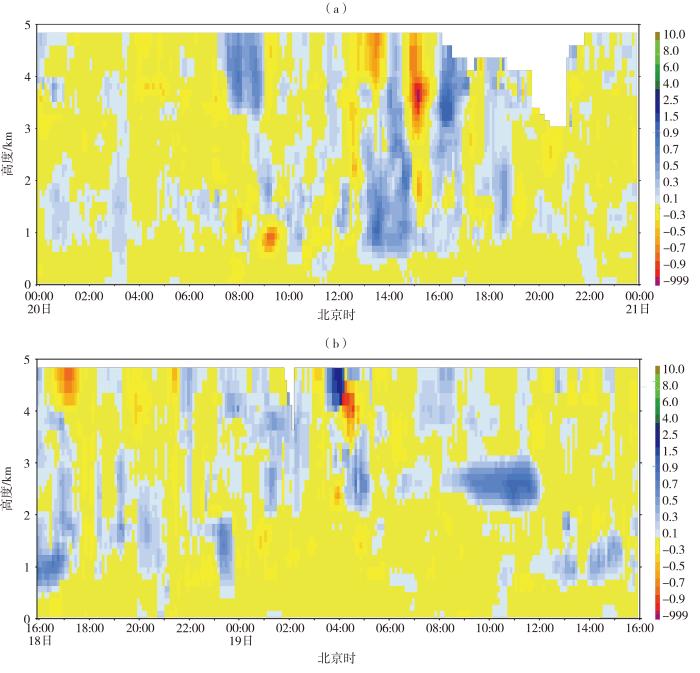 2023年3月20日(a)和4月18日(b)沙尘过程中酒泉站风廓线雷达垂直速度的时间-高度剖面(单位:m·s-1)