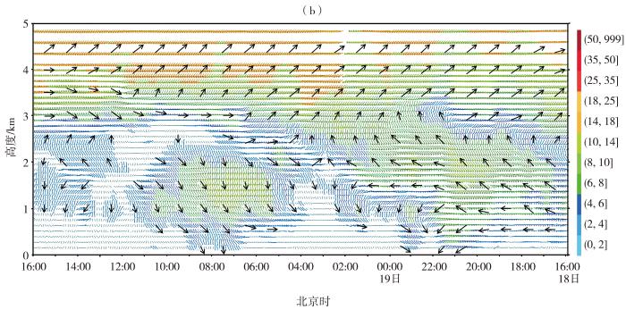 2023年3月20日(a)和4月18日(b)沙尘过程中酒泉站风廓线雷达风场(风矢,单位:m·s-1)的时间-高度剖面(自右至左)