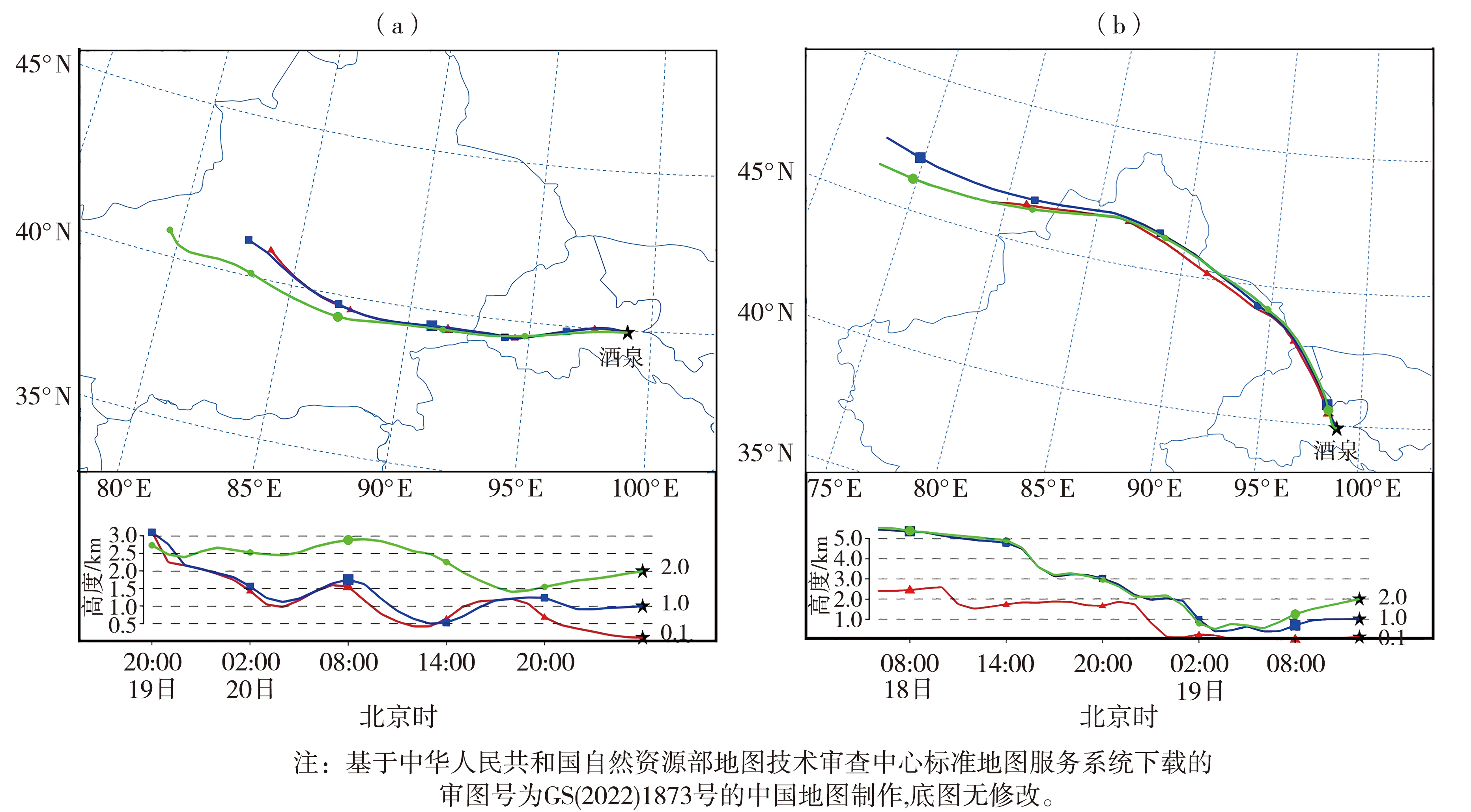 | 图4 2023年3月21日02:00(a)、4月19日12:00(b)酒泉站HYSPLIT模型分析 |