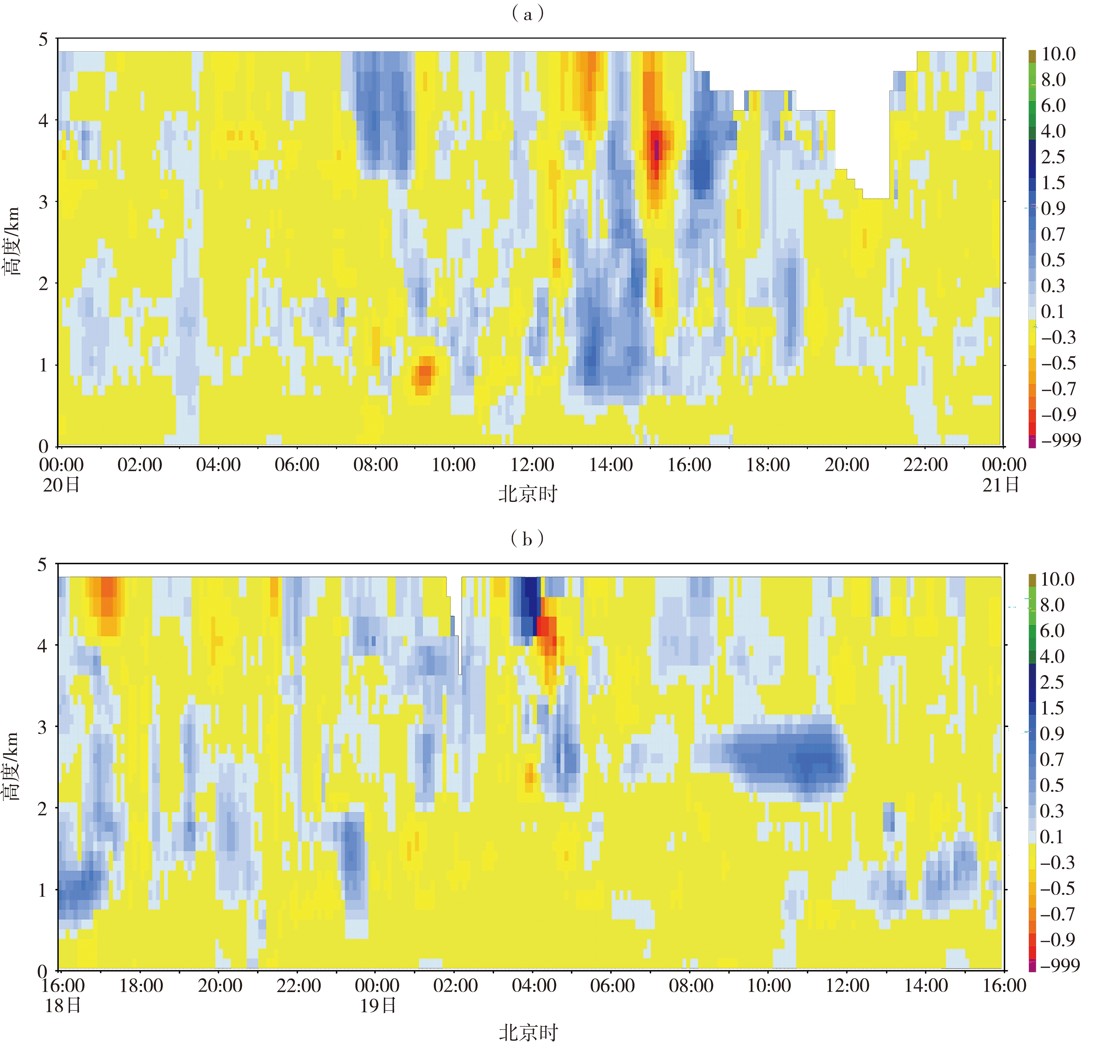 | 图6 2023年3月20日(a)和4月18日(b)沙尘过程中酒泉站风廓线雷达垂直速度的时间-高度剖面(单位:m·s-1) |