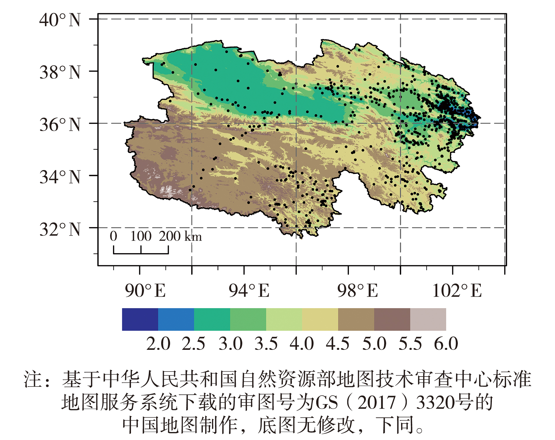 | Fig.1 Spatial distribution of topography (the color shaded, Unit: km) and meteorological stations (black dots) in Qinghai Province |