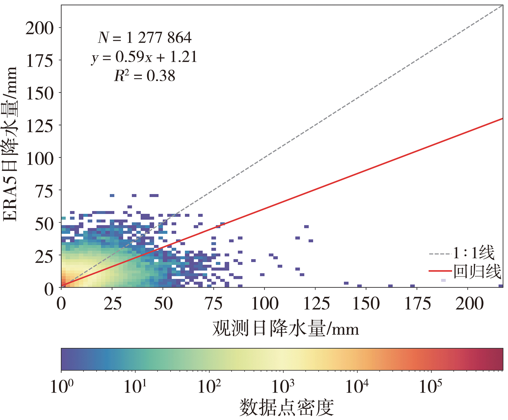 | 图2 2016—2021年青海高原ERA5降水再分析资料与站点观测日降水量的对比散点图 (N代表总样本量) |