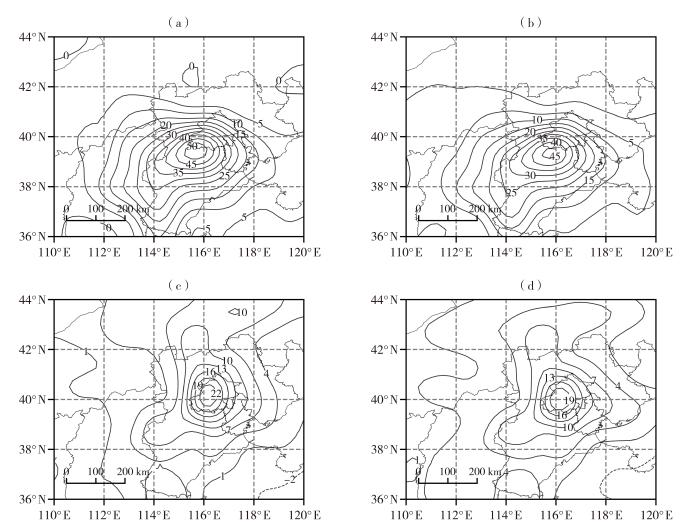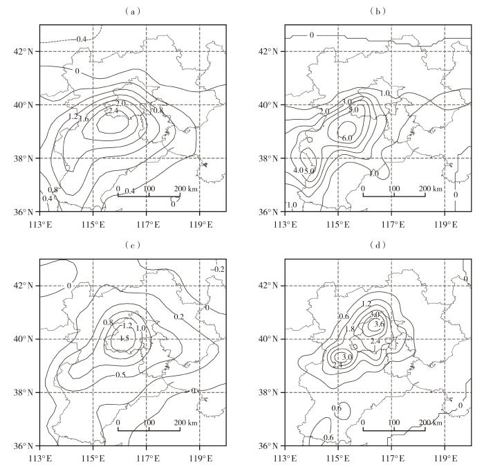 由于水平散度项和水平变形项对低层锋生的影响较大,与垂直运动有关的倾斜项对锋生作用影响较小,下面主要讨论水平散度项和水平变形项对低层锋生的影响。假相当位温等值线越密集则干湿气团的对峙越强,锋生也越明显(刘向文等, 2009)。30日14:00[图9(a)],925 hPa河北有两个辐合中心,在强辐合区中由水平散度项造成了明显的锋生作用;31日14:00[图9(b)],辐合区向北移动,强度减弱,而锋生区也向北移动,锋生函数的水平散度项也减小。变形场可以引起水汽的汇合,使得水汽和温度梯度增大,从而形成一条狭长的温湿对比较强的带状区域,对锋生有重要作用。分析水平变形项和切变变形项的分布可知,变形锋生和切变变形之间具有很好的对应关系,变化较一致,切变变形对锋生起主要作用,引发变形锋生,而伸长变形作用较小(图略)。30日14:00[图9(c)],切变变形大值中心位于京津冀三地交界处,与锋生函数的水平变形项位置较为接近;31日14:00[图9(d)],锋生函数的水平变形项随着切变变形大值区向北移动,强度也减弱。因此对于京津冀地区暴雨中的锋生而言,水平散度项和水平变形项两者作用相当,从30日到31日随着系统移动,锋生作用逐渐减小。