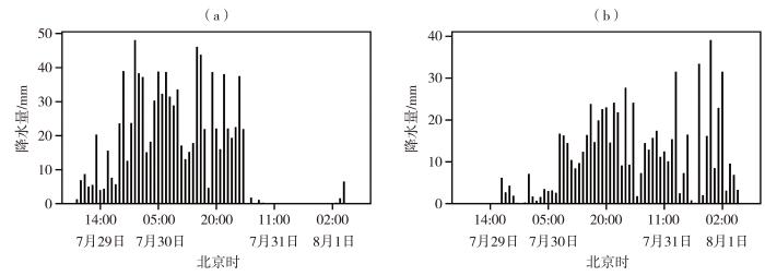 2023年7月29日08:00—8月1日08:00梁家庄站(a)和紫荆关站(b)逐小时雨量分布