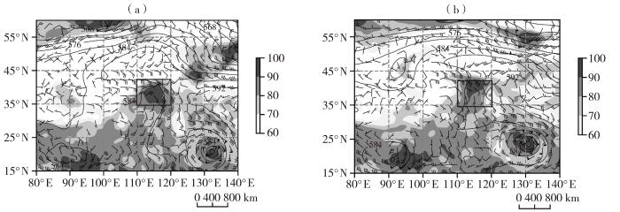 2023年7月30日20:00(a)和31日20:00(b)500 hPa高度场(黑色等值线,单位:dagpm)、850 hPa相对湿度(填色,单位:%)及风场(风矢,单位:m·s-1)