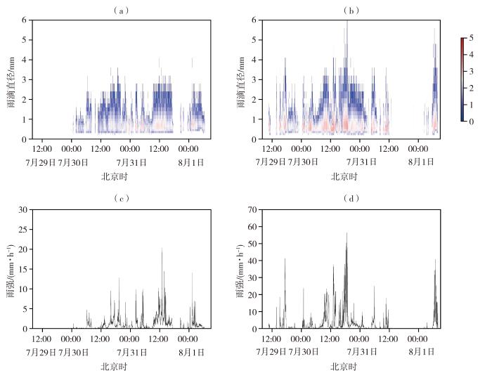 The variation of raindrop number concentration (a, b, Unit: mm-1·m-3) and rainfall intensity (c, d) at Huailai Station (a, c) and Baoding Station (b, d) from 29 July to 1 August 2023