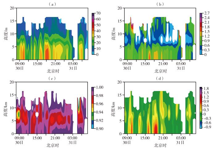 2023年7月30—31日保定站双偏振雷达反射率因子(a,单位:dBZ)、差分反射率因子(b,单位:dB)、相关系数(c)及差分相移率[d,单位:(°)·km-1]的时间-高度剖面