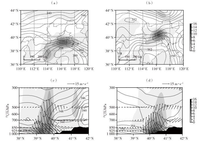 本次暴雨天气过程的形成与锋面的发展有紧密联系,7月30日14:00[图7(a)],在38°N—40°N范围内出现锋生,有明显的正值中心带,最大值超过16×10-9 K·m-1·s-1,锋生函数的分布与假相当位温(θse)等值线密集区一致;垂直方向上[图7(c)],40°N以北为对流稳定区,39°N以南为对流不稳定区,39°N—40°N θse锋区随高度呈明显的垂直结构,为中性层结特征,但不断有偏北气流向暖湿气流下方入侵,经向风形成强辐合区,θse等值线密集,出现强锋生,形成锋面次级环流,锋生次级环流较强使得上升运动增强,降雨强度不断增强;31日14:00[图7(b)],θse等值线密集区向北移动,梯度减小,锋生函数大值中心主要位于40°N—41°N之间,较30日下午减弱;垂直方向上[图7(d)],受地形影响锋区随高度向北倾斜,锋生次级环流仍然存在,强度有所减弱,锋生函数的大值中心仍然超过12×10-9 K·m-1·s-1。相较于以往的暴雨天气过程,此次过程与2021年7月21日郑州的极端暴雨过程(齐道日娜等,2023)的锋生函数最大值比较接近。