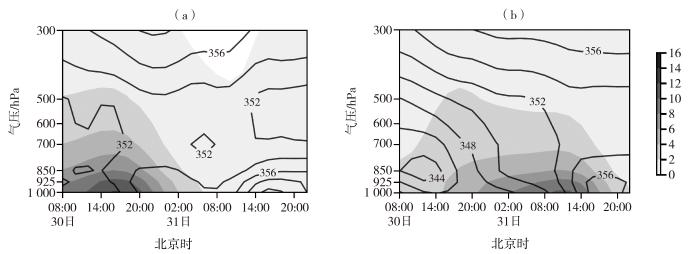 2023年7月30—31日保定(a)和北京(b)假相当位温(等值线,单位:K)和锋生函数(灰色阴影,单位:10-9 K·m-1·s-1 )的时间-高度剖面