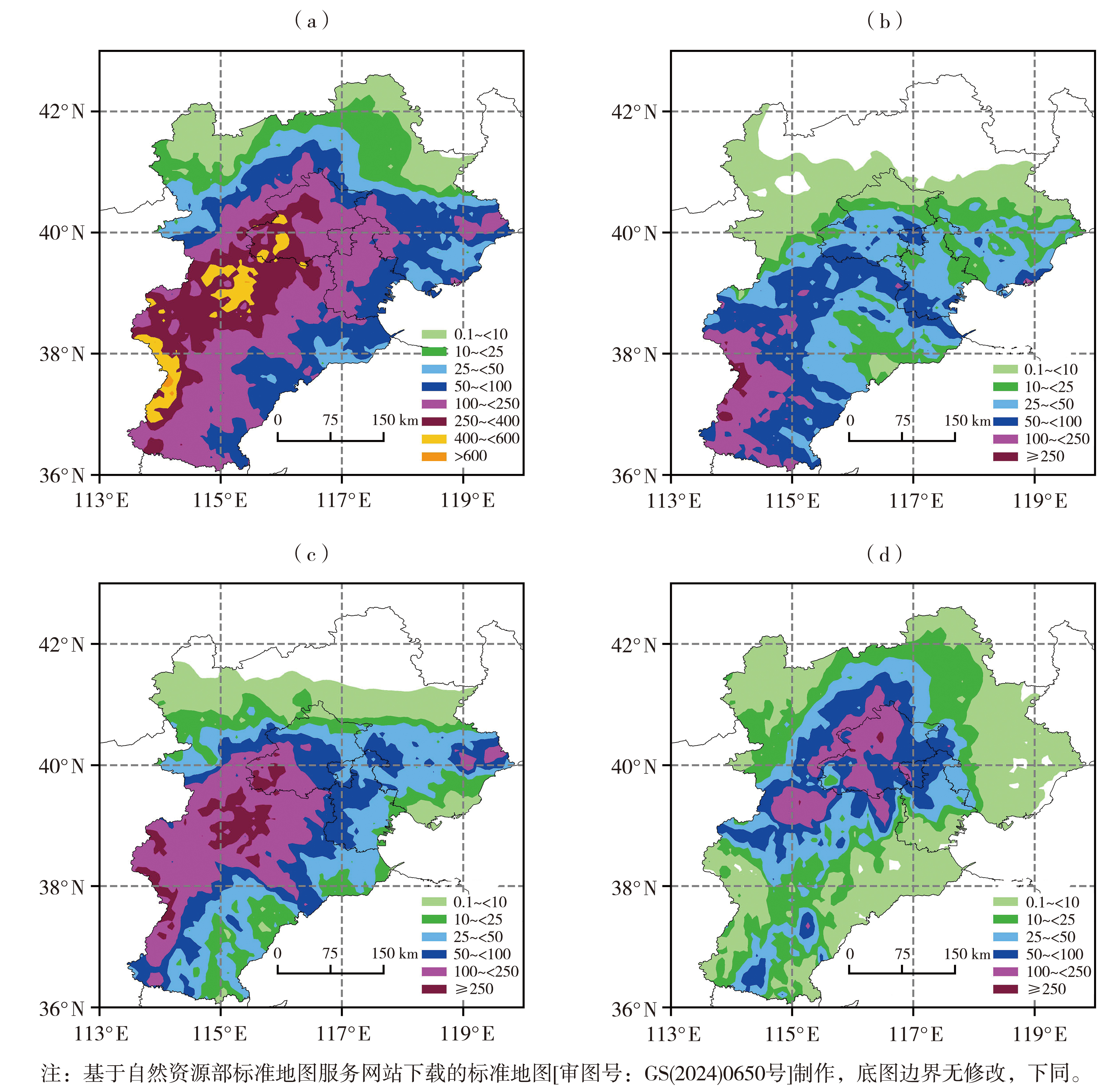 | 图1 京津冀区域2023年7月29日08:00—8月1日08:00累计降水量(a)及29日08:00—30日08:00(b)、30日08:00—31日08:00(c)、31日08:00—8月1日08:00(d)逐24 h降水量空间分布(单位:mm) |