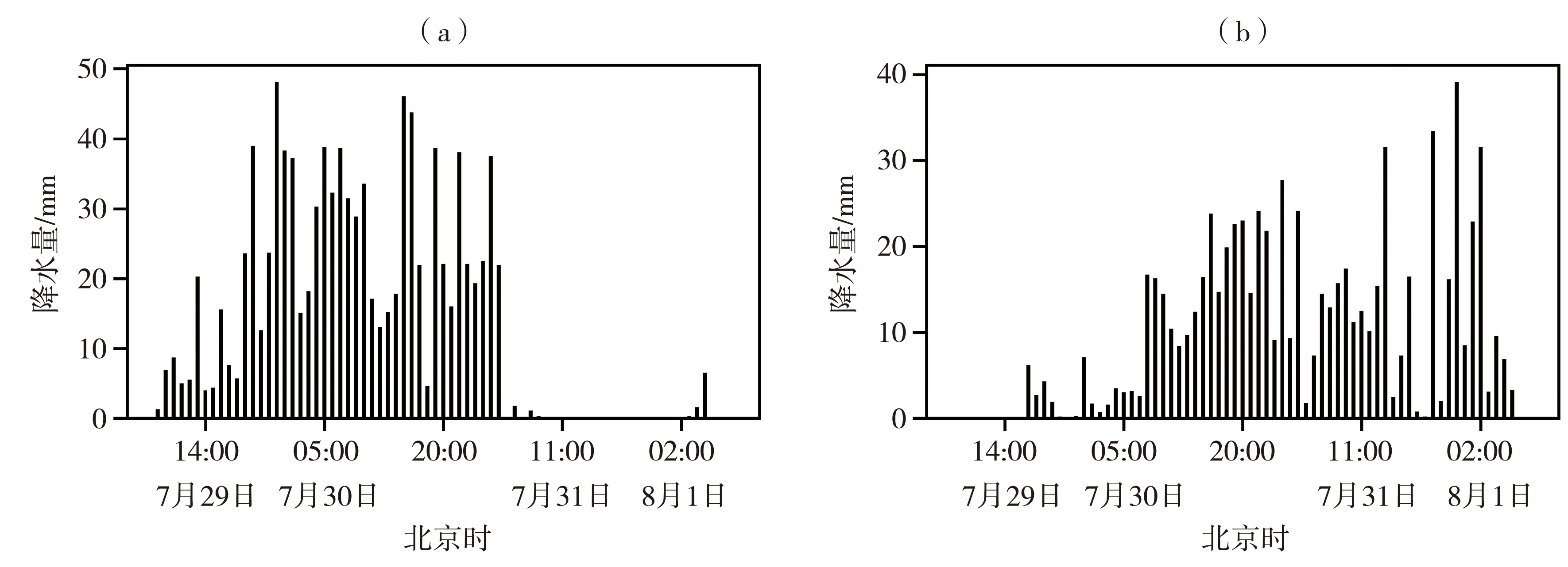 | Fig.2 The hourly rainfall distribution at Liangjiazhuang Station (a) and Zijingguan Station (b) from 08:00 on 29 July to 08:00 on 1 August 2023 |