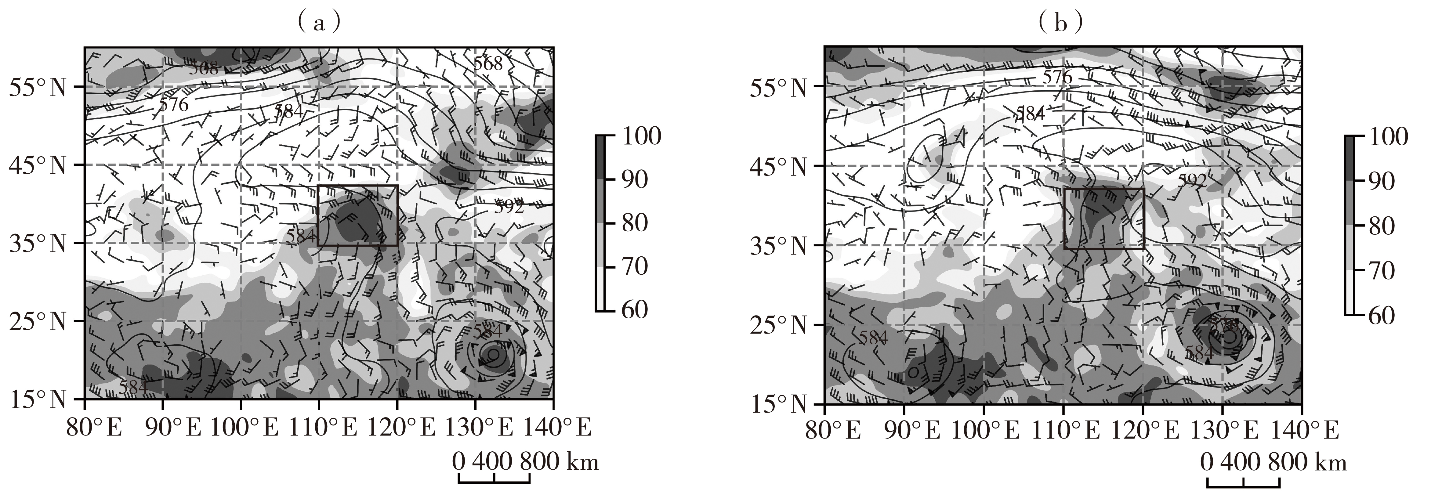 | 图3 2023年7月30日20:00(a)和31日20:00(b)500 hPa高度场(黑色等值线,单位:dagpm)、850 hPa相对湿度(填色,单位:%)及风场(风矢,单位:m·s-1) (图中黑色方框为研究区域) |