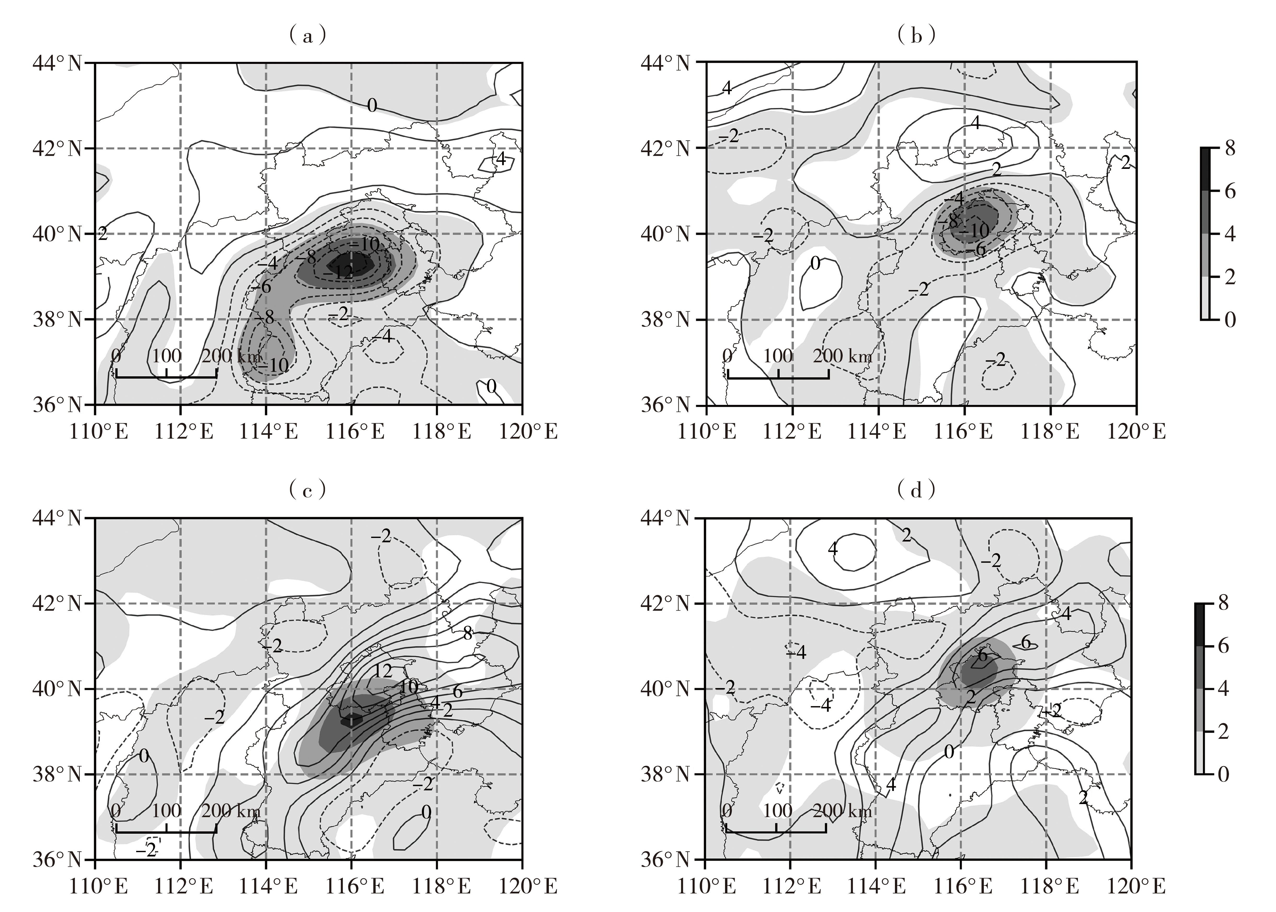 | 图9 2023年7月30日14:00(a、c)和31日14:00(b、d)925 hPa锋生函数水平散度项(灰色阴影,单位:10-9 K·m-1·s-1)叠加散度(等值线,单位:10-5 s-1)(a、b)和锋生函数水平变形项(灰色阴影,单位:10-9 K·m-1·s-1)叠加切变变形(等值线,单位:10-5 s-1)(c、d) |
