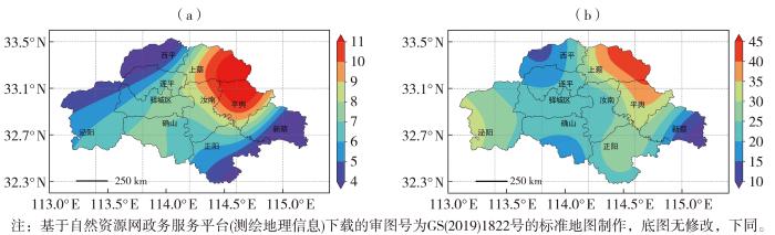 2001—2023年驻马店TC远距离暴雨日数(a,单位:d)及其在区域性暴雨总日数中的占比(b,单位:%)的空间分布