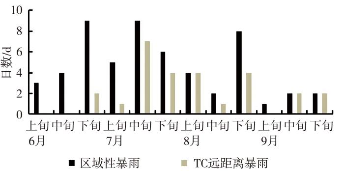 2001—2023年6—9月驻马店区域性暴雨日数及TC远距离暴雨日数逐旬分布