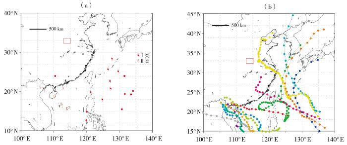 2001—2023年驻马店TC远距离暴雨期间TC中心的位置分布(a)及两类TC路径汇总(b)