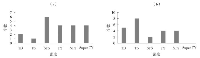 引发远距离暴雨的TC最强强度(a)和产生远距离暴雨时刻的TC强度(b)