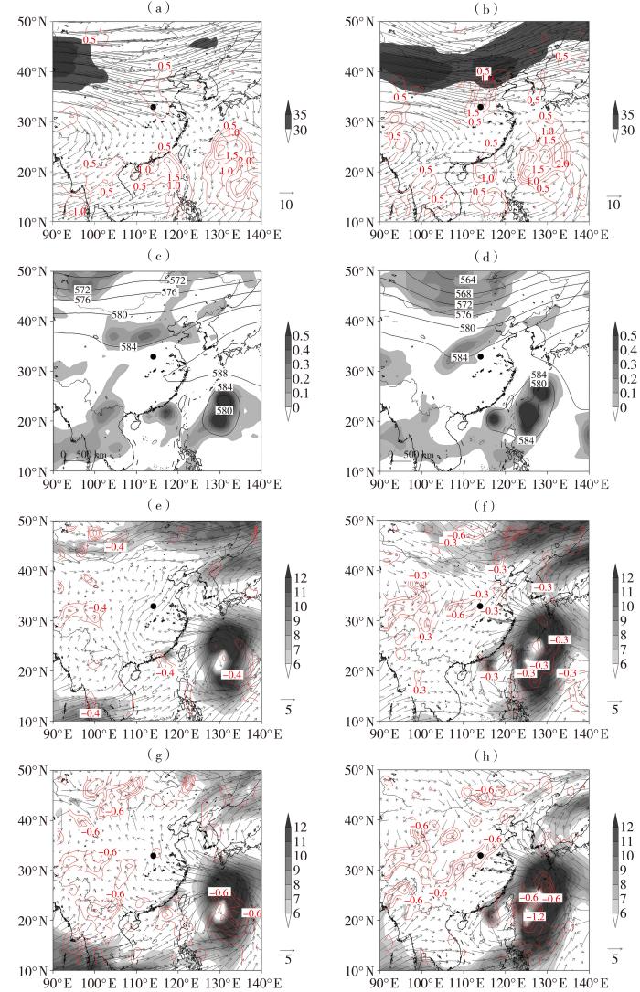 The 200 hPa jet (arrow vectors, Unit: m·s-1), divergence (the isolines, Unit: 10-6 s-1), and isotachs (the grey shaded, Unit: m·s-1) (a, b), the 500 hPa geopotential height field (the contour lines, Unit: dagpm) and vorticity (the grey shaded, Unit: 10-5 s-1) (c, d), and the wind fields (arrow vectors, Unit: m·s-1), divergence (the isolines, Unit: 10-6 s-1), and isotachs (the grey shaded, Unit: m·s-1) at 700 hPa (e, f) and 850 hPa (g, h) at t-24 (a, c, e, g) and t0 (b, d, f, h) of the type Ⅱ TRP