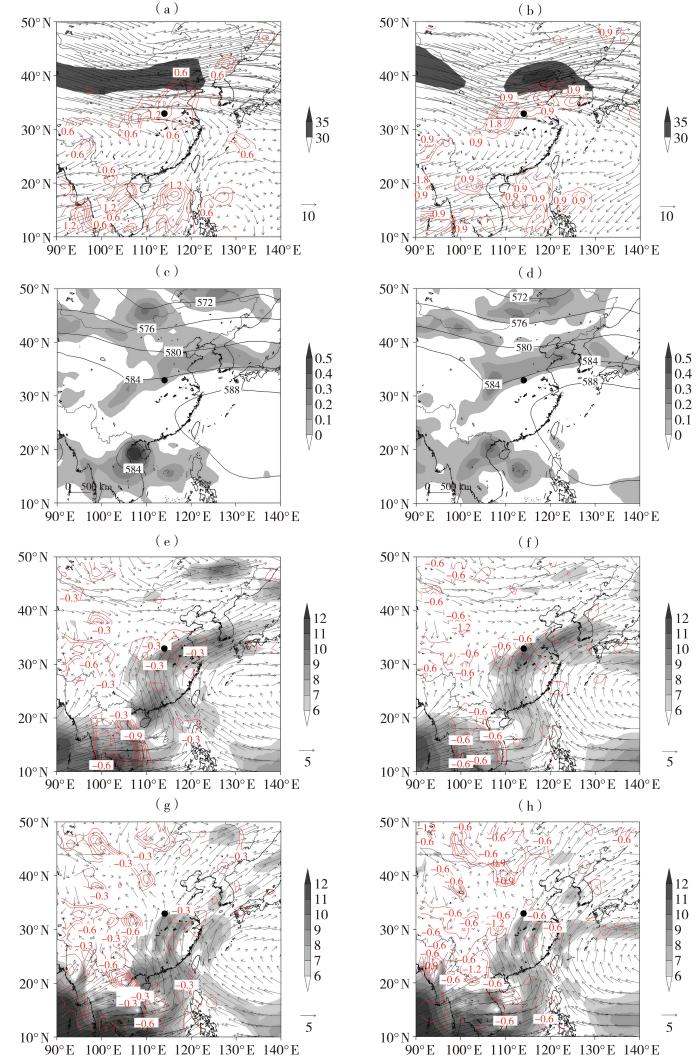 Ⅱ类远距离暴雨t-24(a、c、e、g)与t0(b、d、f、h)时刻200 hPa急流(箭矢,单位:m·s-1)、散度(等值线,单位:10-6 s-1)及等风速填色(阴影,单位:m·s-1)(a、b)、500 hPa位势高度场(等值线,单位:dagpm)及涡度场(阴影,单位:10-5 s-1)(c、d)、700 hPa(e、f)及850 hPa(g、h)风场(箭矢,单位:m·s-1)、散度(等值线,单位:10-6 s-1)及等风速填色(阴影,单位:m·s-1)