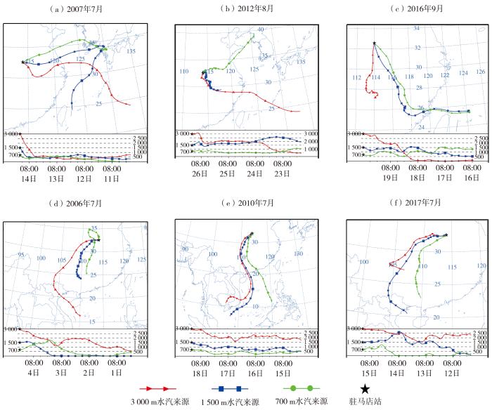 Ⅰ类(a、b、c)和Ⅱ类(d、e、f)驻马店TC远距离暴雨水汽后向轨迹