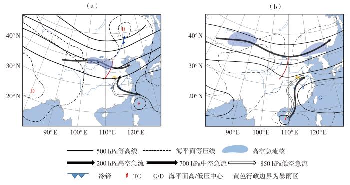 综上,TC远距离暴雨是多系统相互作用的结果。本文试图从水汽特征与环流诊断角度研究其形成机理,但仍存在若干问题有待深入探讨,例如,台湾岛与海南岛附近同时存在双TC时,是否更易诱发远距离暴雨;在相似的环流配置下为何存在未发生暴雨的个例,是否与槽脊深浅及急流强度有关;此外,本文研究的TRP仅限于TC位于130°E以西、15°N以北时,而在此范围之外仍存在若干超远距离TRP,其水汽与环流特征是否与Ⅰ类、Ⅱ类具有共性或差异,均值得进一步系统研究。