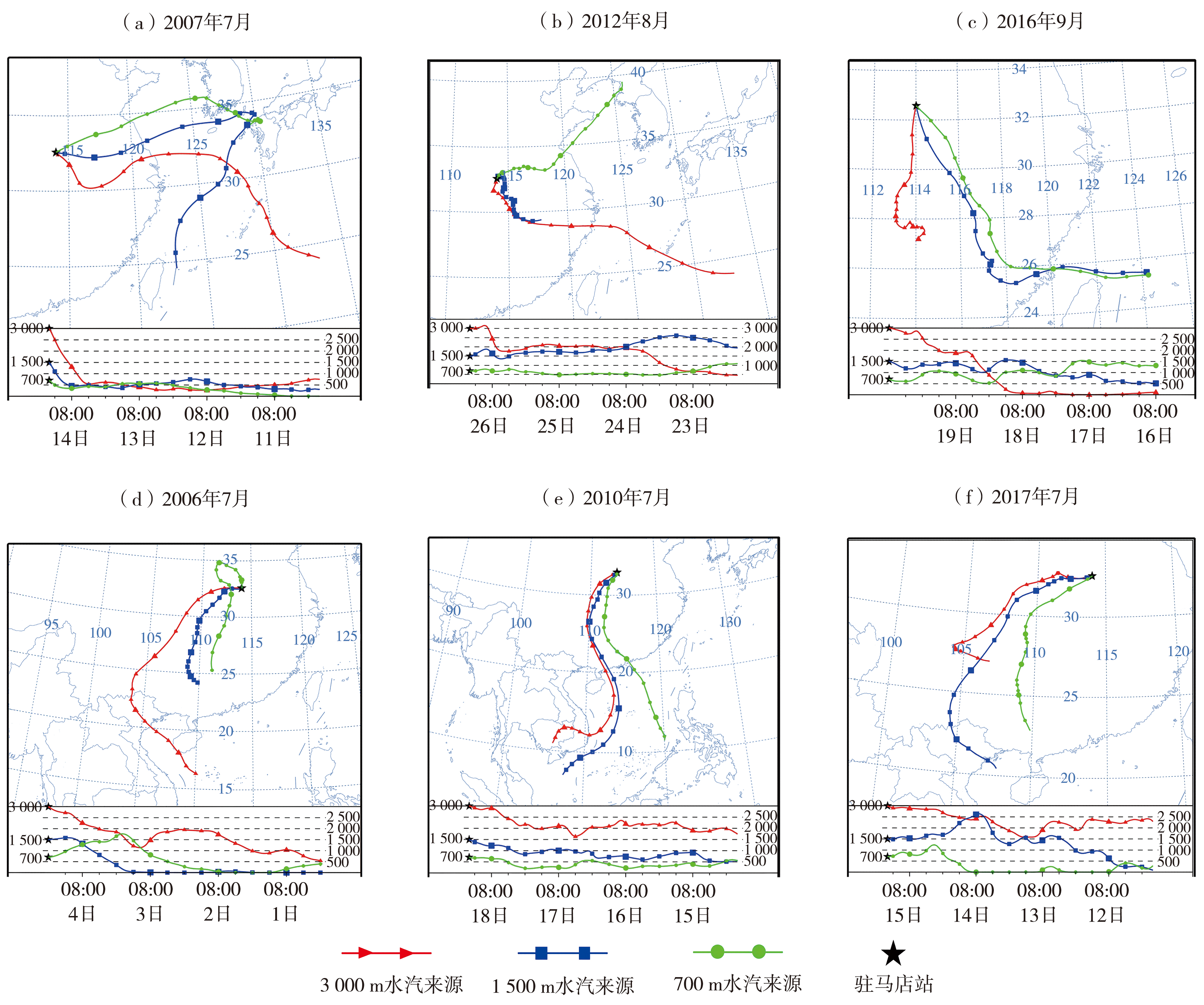 | 图7 Ⅰ类(a、b、c)和Ⅱ类(d、e、f)驻马店TC远距离暴雨水汽后向轨迹 |