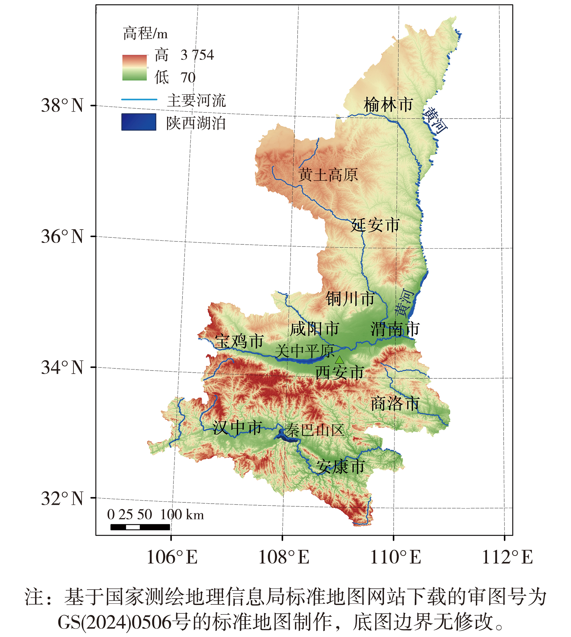 | Fig.1 The distribution of topographic height,prefecture-level cities and three representative landforms in Shaanxi Province |