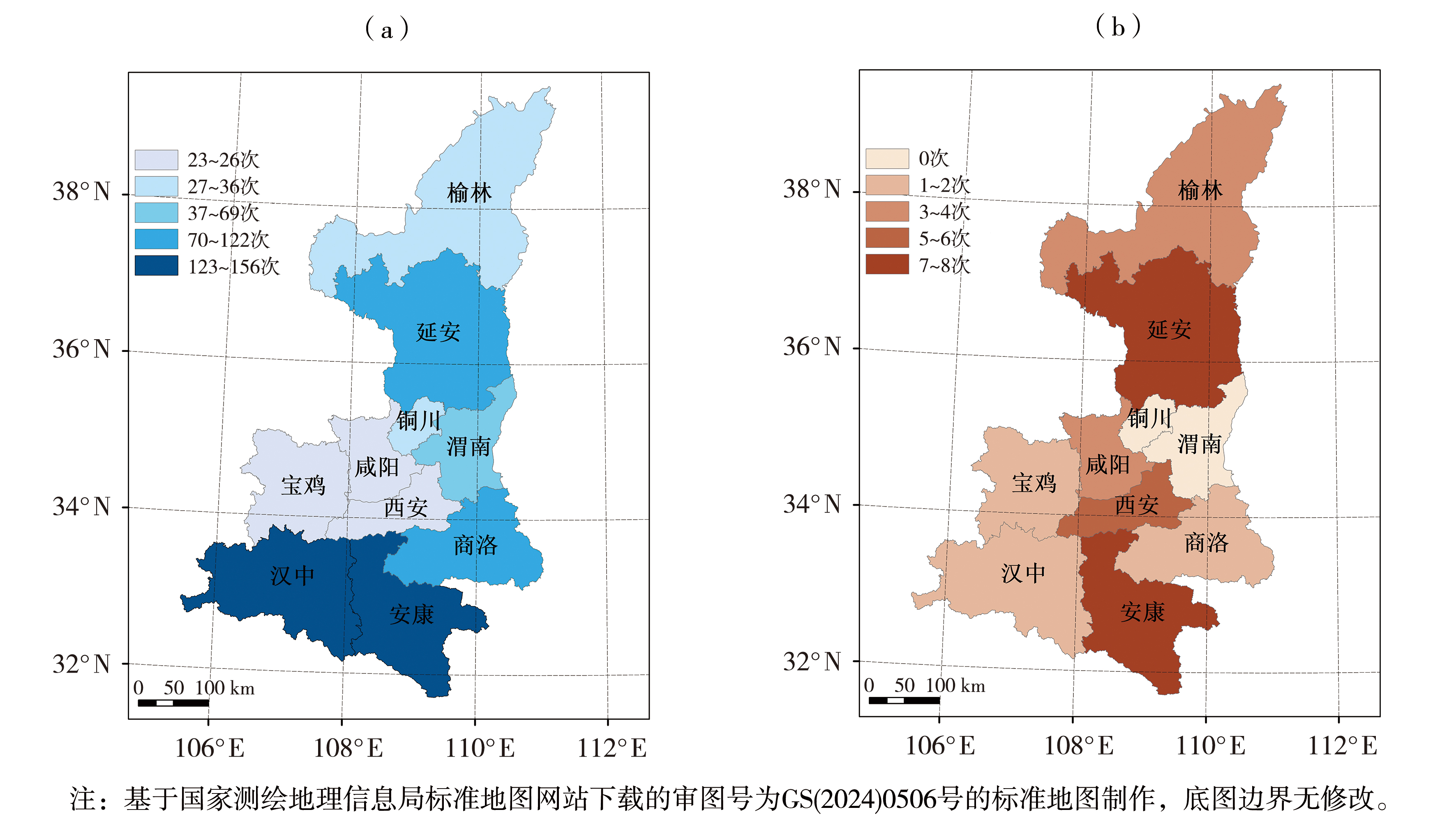 | 图3 陕西省2008—2023年暴雨洪涝(a)和次生地质灾害(b)次数空间分布 |