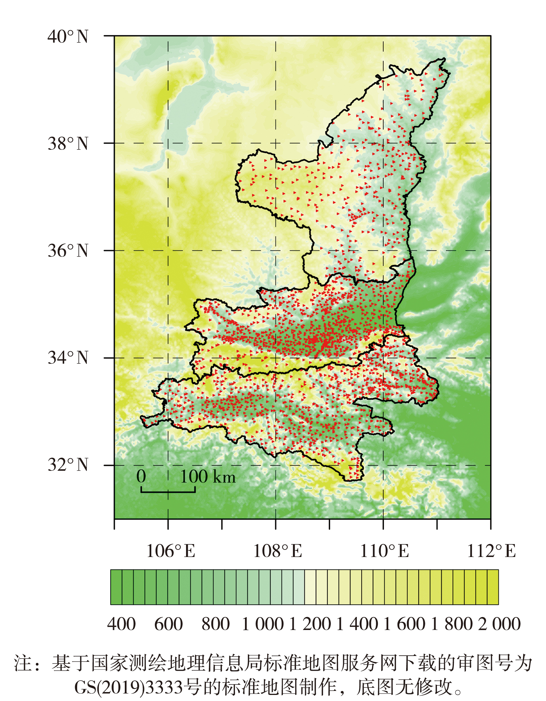 | Fig.1 Topographic elevation of Shaanxi Province (Unit: m; black lines represent the boundaries of different regions, with northern Shaanxi, Guanzhong, and southern Shaanxi from north to south) and distribution of the density observation stations (the triangles) |