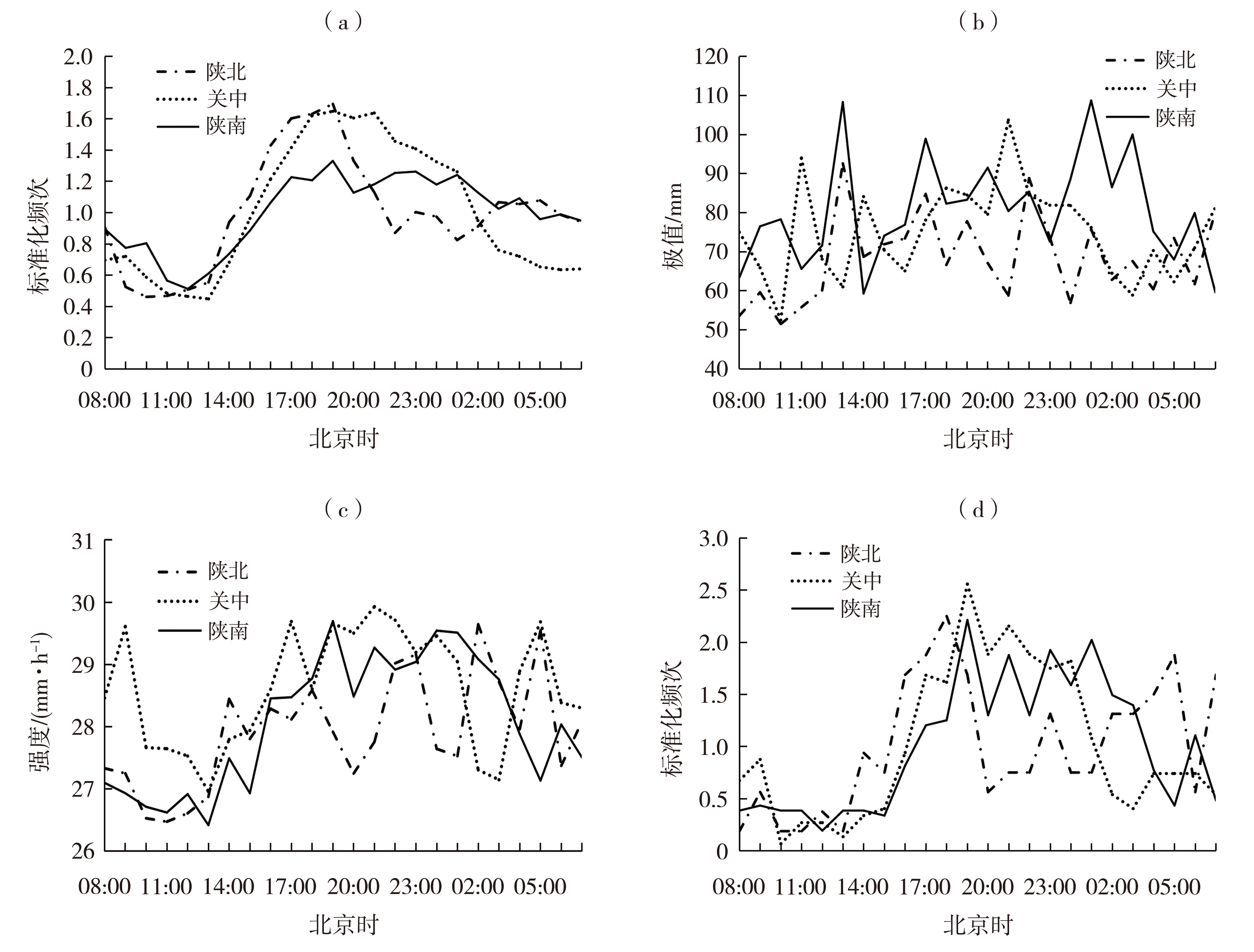 | 图6 2009—2023年陕西不同地区短时强降水标准化频次(a)、极值(b)、强度(c)和极端短时强降水标准化频次(d)日变化 |