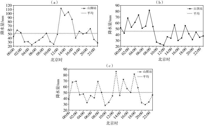 山脚站降水高峰期主要集中在13:00—21:00[图2(a)],这9个时次降水量之和为663.20 mm,占总降水量(1 237.45 mm)的54%左右;01:00出现小高峰,05:00降到全天最低值(23.45 mm),后小幅上升,09:00再次下降,11:00出现次低值,然后降水量暴增,在13:00达到最大值之后略有波动,15:00后出现骤降直到17:00,后在全天均值附近摆动,22:00降水量明显减小。山顶站00:00—09:00降水较其余时段明显偏多[图2(b)],这10个时次的降水量之和为590.40 mm,占总降水量(1 098.90 mm)的54%左右,其中08:00出现降水量最大值(81.65 mm),12:00出现最小值(21.85 mm),后在平均值附近波动。山腰站大多时次降水量介于山脚站和山顶站之间,波动和山脚站基本一致,降水主要集中在12:00—19:00[图2(c)],8个时次的降水量之和为494.75 mm,占总降水量(1 205.45 mm)的41%左右,最大值(86.00 mm)与山脚站一样出现在13:00,10:00出现降水量的最小值(28.00 mm)。山脚站和山腰站降水量大值时段主要集中在午后到傍晚,且与山腰站相比,山脚站的逐时降水量表现出更大的波动,山顶站降水主要集中在凌晨到早晨。