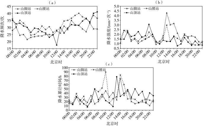 2022—2023年汛期梵净山山脚站、山腰站和山顶站的平均降水频次(a)、降水强度(b)和降水累计时间(c)日变化