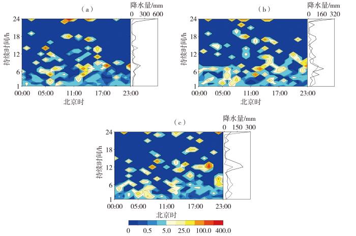 2022—2023年汛期梵净山山脚站(a)、山腰站(b)和山顶站(c)不同持续时间降水的降水量日变化