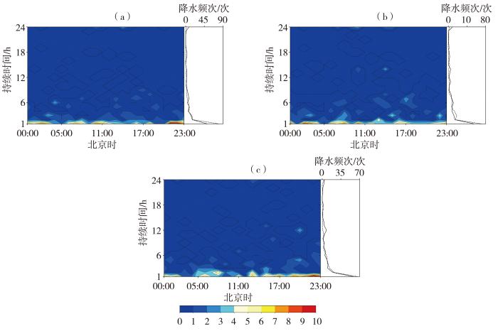 2022—2023年汛期梵净山山脚站(a)、山腰站(b)、山顶站(c)不同持续时间的降水频次日变化