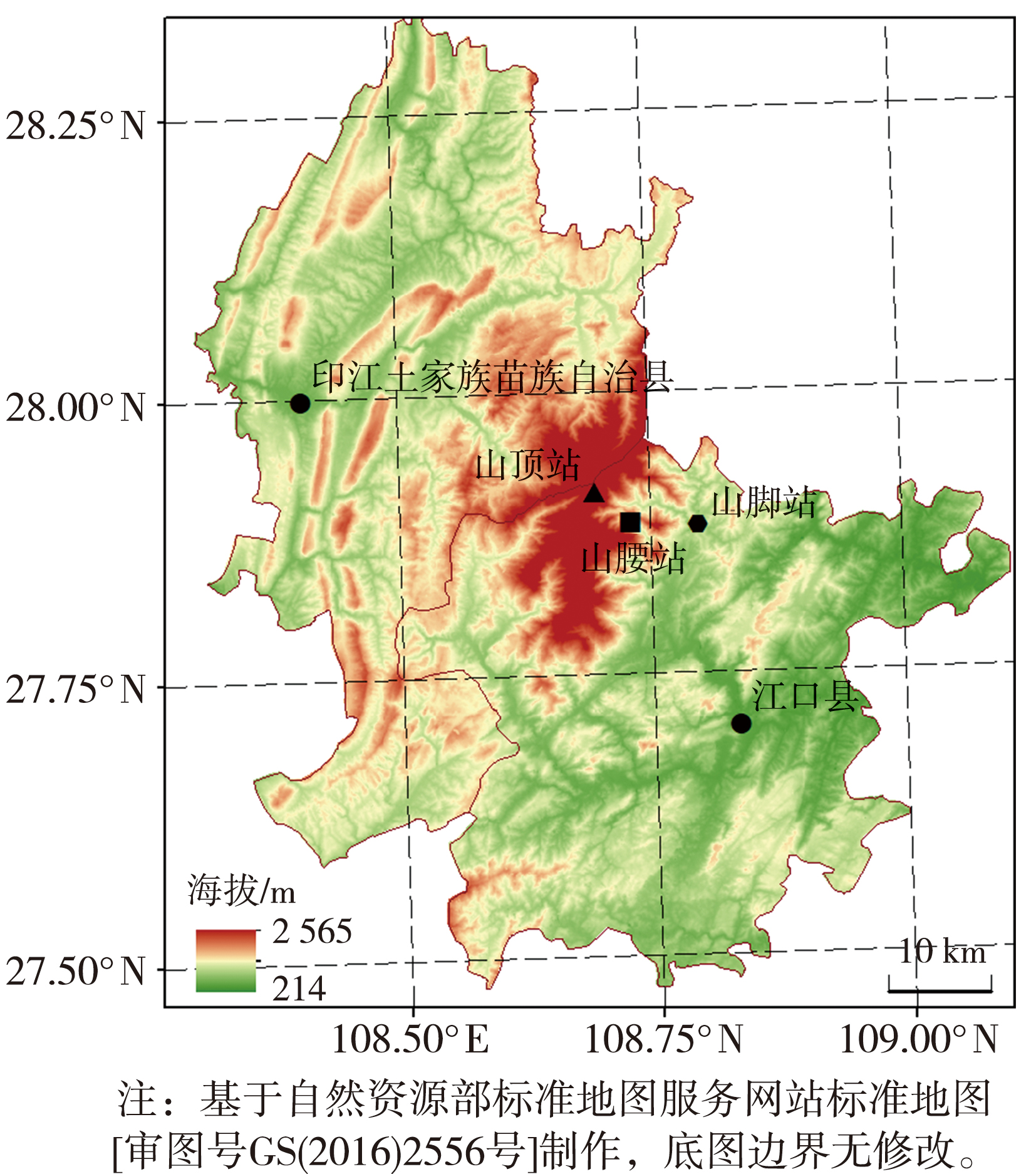 | 图1 梵净山山脚、山腰和山顶气象站点分布 |